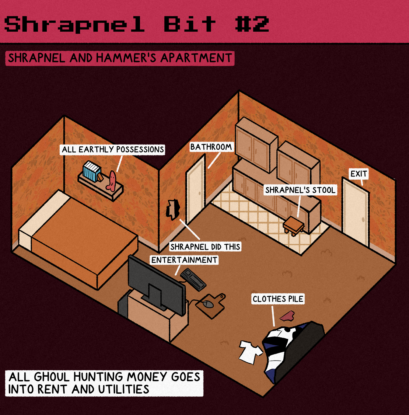 panel 1: Shrapnel is bending over to pick up a dark orange ball with a black symbol in the shape of a dinosaur print. Hammer is standing behind her. The sky is dark. There is a coniferous tree in the background, along with a bush. Shrapnel is saying "Lemme just grab this real quick." Hammer replies "Did you clean your inventory." Shrapnel says "Yeah." panel 2: Depicted is Shrapnel's "inventory". It resembles the grid-based inventory of Resident Evil 4 and is filled with junk. In the top left corner is a portait of Shrapnel. Below the portrait is Shrapnels name, level, and experience. In the bottom left corner is a slot labeled "main hand:". In this slot is Shrapnel's handgun. The rest of the space is taken up by the inventory grid. There are multiple boxes of ammo, pieces of trash, a plushie of a purple frog-like creature, stacks of cash, Ice Age on DVD, a Ghoul Hunter license, a Portal Scroll from Path of Exile, a large submarine sandwich, a mix of green, yellow, and brown herbs similar to a mix of herbs from Resident Evil 4, a big rock, a gold ring, and a dark orange orb with a black symbol of a dinosaur print on it with a mouse cursor hovering over it. panel 3: Indoors in some kind of shop. In the top left corner is the text "Hours later". Regi is standing at a wooden counter facing the reader. The silhouettes of Shrapnel and Hammer are visible on the reader-side of the counter. Behind Regi is a small muted green creature with bright lime green details around its eyes and on its ears. The creature has a round head with long bulbous ears protruding out the top ending in a point. There is a shelf behind Regi with three items on it: a green gem, a bag with a skull and crossbones on it, and a black cat figure with white eyes. Floating above the counter is a dark orange ball with a black symbol in the shape of a dinosaur print with a bright orange soul energy surrounding it. Regi is saying "Thanks for taking out that shadowbird! It must of been difficult." Shrapnel replies "It was no sweat, Regi!" panel 4: Focus is on Regi's hand holding a stack of cash. In the bottom left and right corner is Shrapnel and Hammer respectively. They are both looking up at the stack of cash in awe. Shrapnel's eyes have stars in them. The background is a light and dark green pattern radiating from the center. Regi is saying "Here's 200 big ones!!!" panel 5: Shrapnel is standing against a solid red-pink background. She is looking slightly upwards with an excited look on her face. Above her is a thought bubble depicting Lady Bigarm. Above the bubble is the text "She thought of the Lady Bigarm figure she could buy."